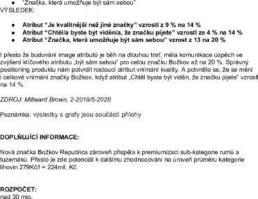 I přesto že budování image atributů je běh na dlouhou trať, měla komunikace úspěch ve zvýšení klíčového atributu „být sám sebou“ pro celou značku Božkov až na 20 %. Správný positioning produktu nám potvrdit rostoucí atribut vnímání kvality. A potvrdilo se, že se mění