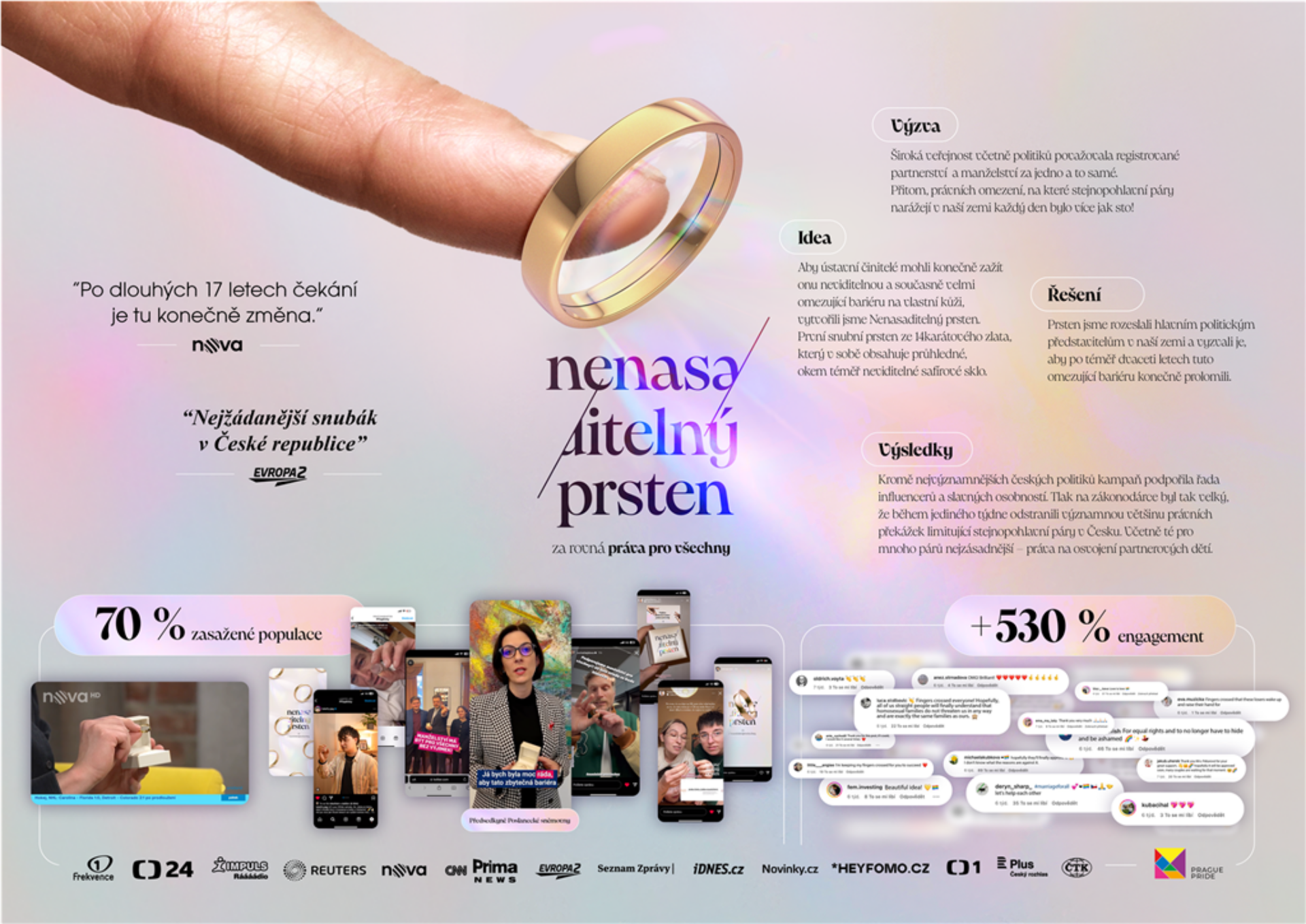 Bariéru, kterou zažívají stejnopohlavní páry jsme demonstrovali jednoduchým, ale přímočarým symbolem. Snubním prstenem. Vytvořili jsme limitovanou edici prstenu, ze 14k zlata, s neviditelnou bariérou ze safírového skla ve svém středu. Na první pohled standardní snubní prsten tak nešlo nasadit. Jednoduchou, manželskou symboliku jsme tak přetvořili v ukázku toho, s čím se stejnopohlavní páry potýkají každý den.